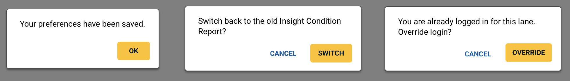 - One or two buttons only. If two buttons, there must be a confirming contained button, and a dismissing text button.